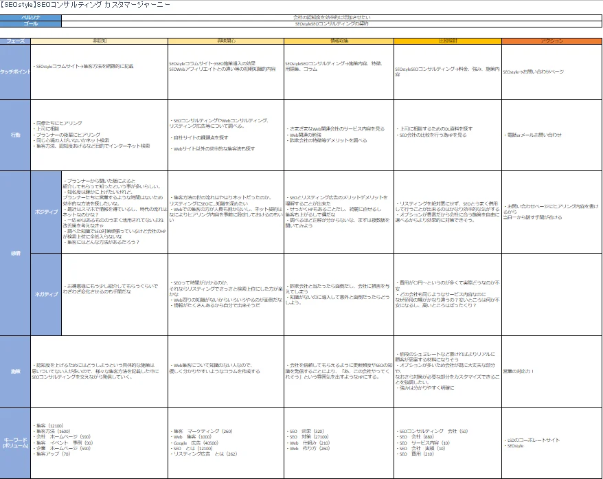 ペルソナを作成したら、それらがどのように運営サイトと接点を持ち、コンバージョンを獲得するルート、カスタマージャーニーを作成します。カスタマージャーニーは非認知から始まり、興味関心→情報収集→比較検討→アクション=コンバージョンと段階を踏みます。表を作って今回作成したペルソナの心理状況とあてはめながら埋めていくと、自身のサイトに必要なコンテンツが見えてきます。それに合わせたキーワード・キーワード需要なども併せて表にまとめていくと、より今後必要なコンテンツを見通せるのでお勧めです。